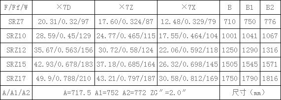 表7、SRZ空氣熱交換器(散熱器)散熱面積F(m2),通風(fēng)凈截面積Ff(m2),參考重量W(Kg),有關(guān)尺寸(mm)一覽續(xù)表